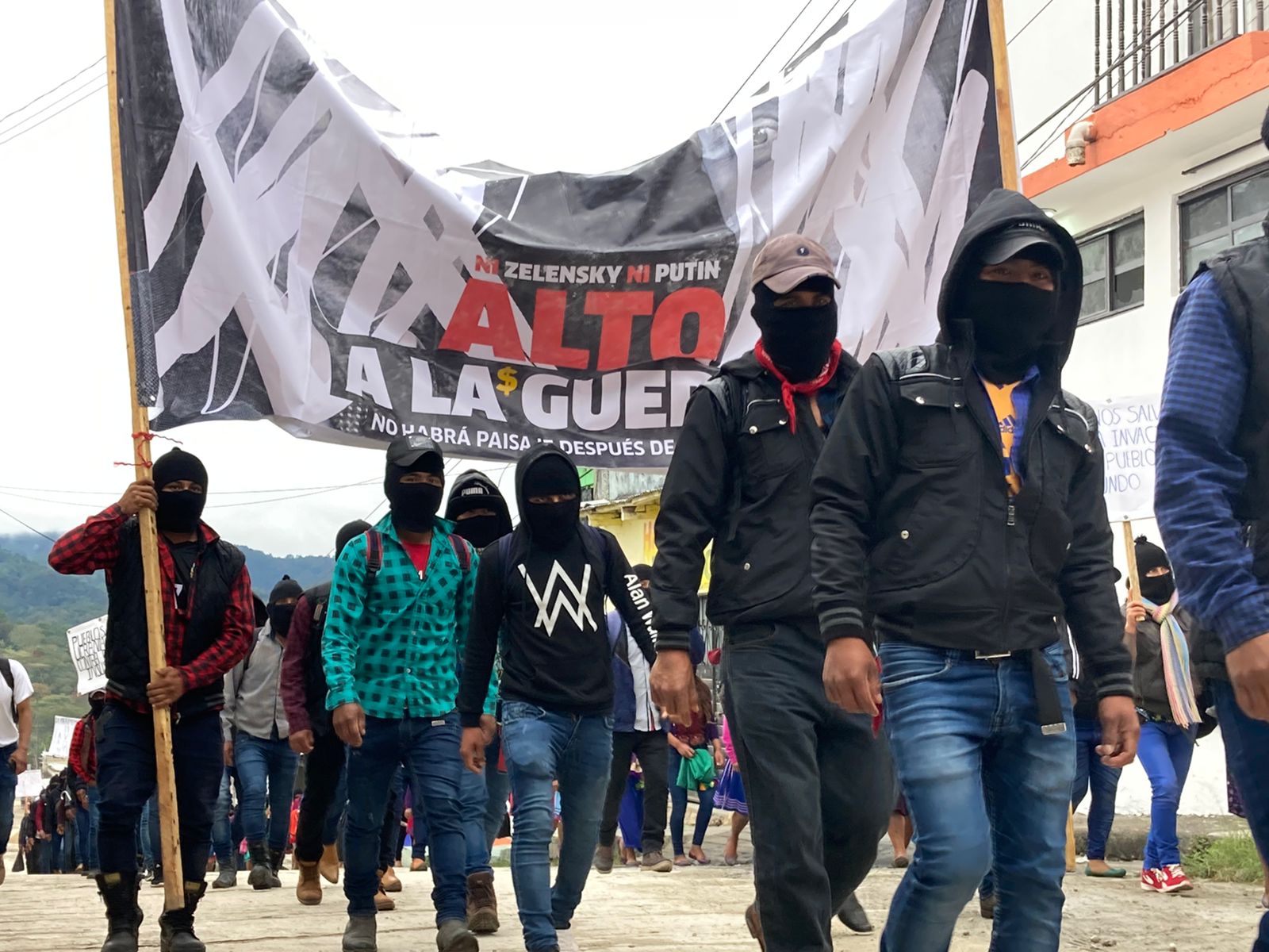 "Ούτε Πούτιν ούτε Ζελένσκι", λένε μερικά από τα πανό που μπορεί να δει κανείς σε ένα ατελείωτο ποτάμι από ζαπατίστας που κυκλώνει την πόλη την πόλη του Σαν Κριστομπάλ δε λας Κάσας.
