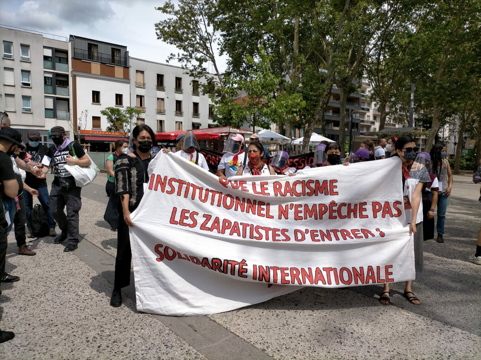 Με μουσικές και συνθήματα, οι ζαπατίστας της Μοίρας 421 και το Κίνημα των Χωρίς Χαρτιά (Sin Papeles) συγκεντρώθηκαν το απόγευμα του Σαββάτου, στις 24 Ιούλη, στο Μοντρέιγ του Παρισιού και πορεύτηκαν προς τρείς χώρους «καταφύγια» όπου διαμένουν, σε συνθήκες άθλιες, πολλοί μετανάστες και μετανάστριες.